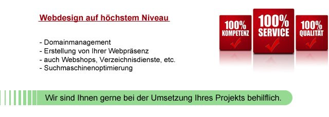 Höchstmaß an Professionalität, sowie Lösungskompetenzen für jede erdenkliche Aufgabenstellung. Hierbei spielt es keine Rolle, ob wir unsere Dienste für kleine, mittlere oder große Projekte anbieten - Sie können sich stets einer optimalen, umsichtigen und zielgerichteten Ausführung sicher sein. Unsere Arbeit richtet sich nach Ihren Wünschen - wir beraten Sie von der Idee an, übernehmen anschließend die Umsetzung und das technische Feintuning. Sie kümmern sich um das Wichtige - Ihr Geschäft.